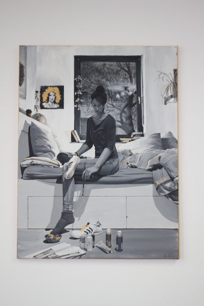 Elena: Ich habe eine Kombination aus Leinwand und Schuhen gewählt. Mein Bild behandelt die Frage, welche Spuren ich hinterlassen möchte. Es ist ein Selbstportrait, welches mich zeigt wie ich meine Schuhsohlen anmale. In der Zeit als das Bild entstand, habe ich mich persönlich viel mit meiner Zukunft beschäftigt und beim Malen viel drüber nachgedacht. Im Bild steckt das Gefühl, nicht wirklich etwas verändern oder Spuren hinterlassen zu können. Ich frage mich, ob es überhaupt möglich ist, nachhaltig etwas zu verbessern oder zu ändern da Strukturen in Politik und Wirtschaft so festgefahren erscheinen. Daher vielleicht doch eher den Fokus auf sich selbst legen?