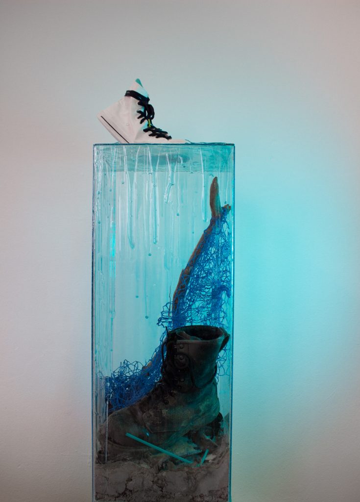 Joelle: Als ich mich begonnen habe mit dem Thema zu beschäftigen, ging es im Rahmen von Corona viel um das Abwägen zwischen Wirtschaft und Gesundheit. In dieser Diskussion tauchten dann auch wieder die Heizpilze für die Restaurants auf, trotz der Tatsache, dass wir eben aufgrund von Corona, einen guten ökologischen Fußabdruck hatten. In diesem Moment war das Thema Umweltschutz der Politik wieder egal. Ich habe viel zum Thema Fast Fashion angesehen und mich damit beschäftigt. Mein Werk zeigt die Menschen auf der anderen Seite der Welt, die den billigen Schuh für uns herstellen und auf der anderen Seite eben diesen weißen Sneaker, der über das Wasser läuft als würde die Herstellung die Person, die ihn trägt, nicht betreffen. Das war meine Wut auf die Politik. Da kam das Thema zum richtigen Zeitpunkt.
